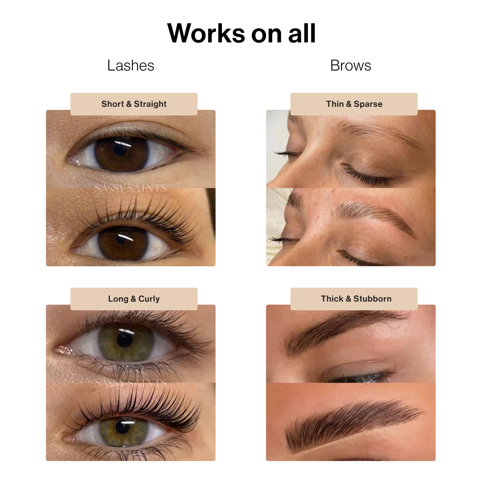 A graphic showing four close-up images: short, straight lashes; long, curly lashes; thin, sparse brows; and thick, stubborn brows, illustrating that a beauty product works on all lash and brow types.
