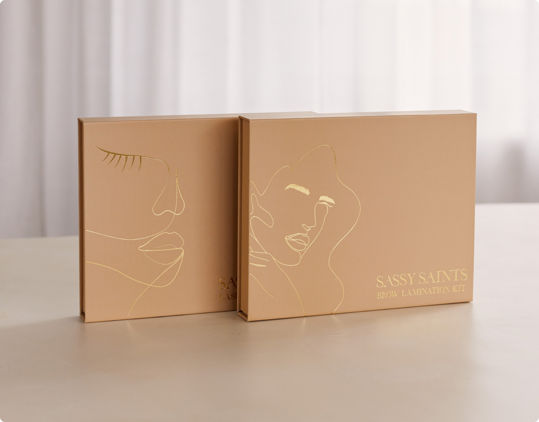 Two beige Sassy Saints brow lamination kit boxes with minimalist gold line art of faces, set on a light surface with a white curtain background.