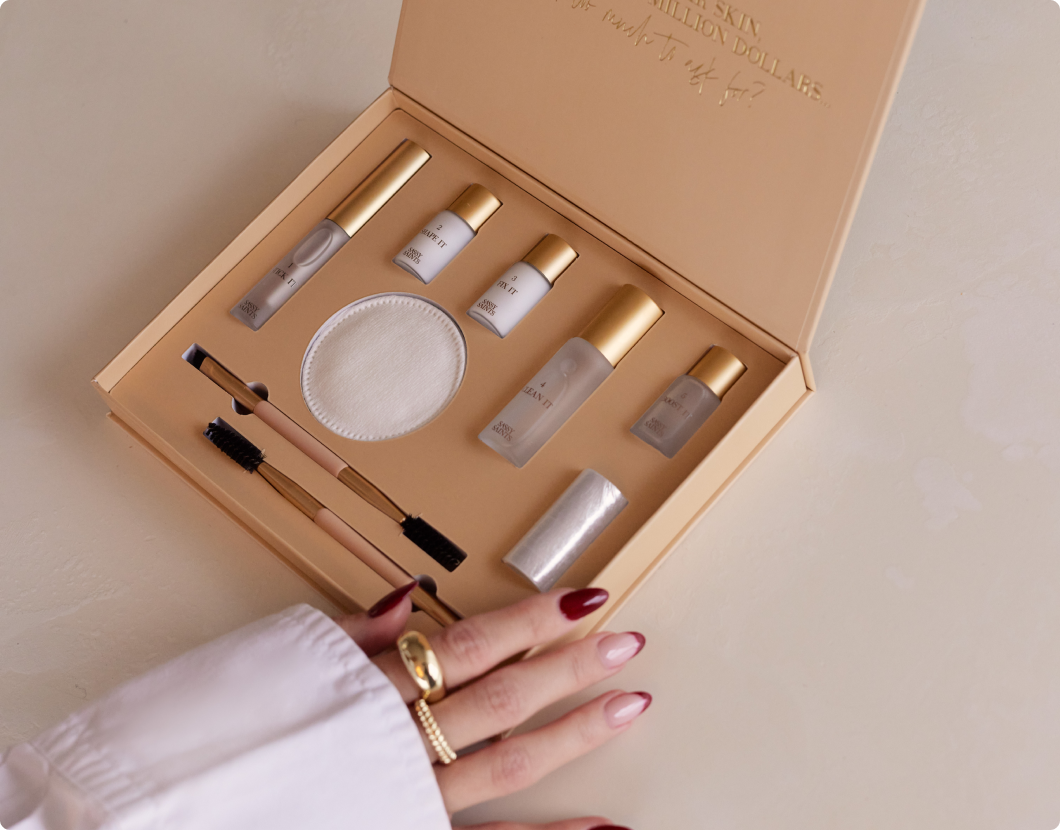 A hand with manicured nails and gold rings reaches for an opened beige beauty kit box containing various skincare bottles, a brush, a spoolie, a round pad, and a spool of gauze.